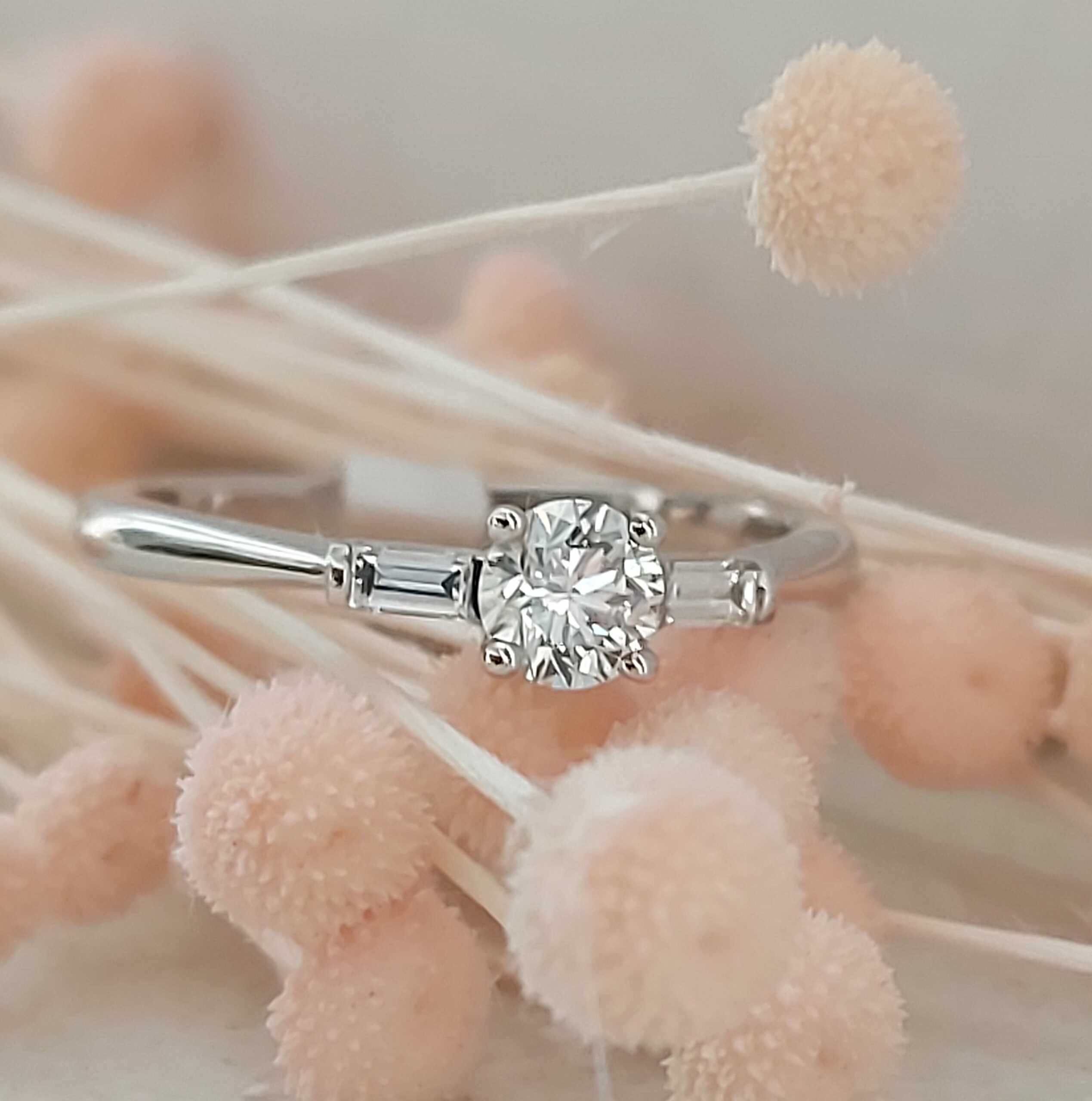 Bague en or blanc 750/1000° recyclé sertie au centre, sur griffes, d’un diamant taille rond brillant et mis en avant par deux diamants taille baguette.