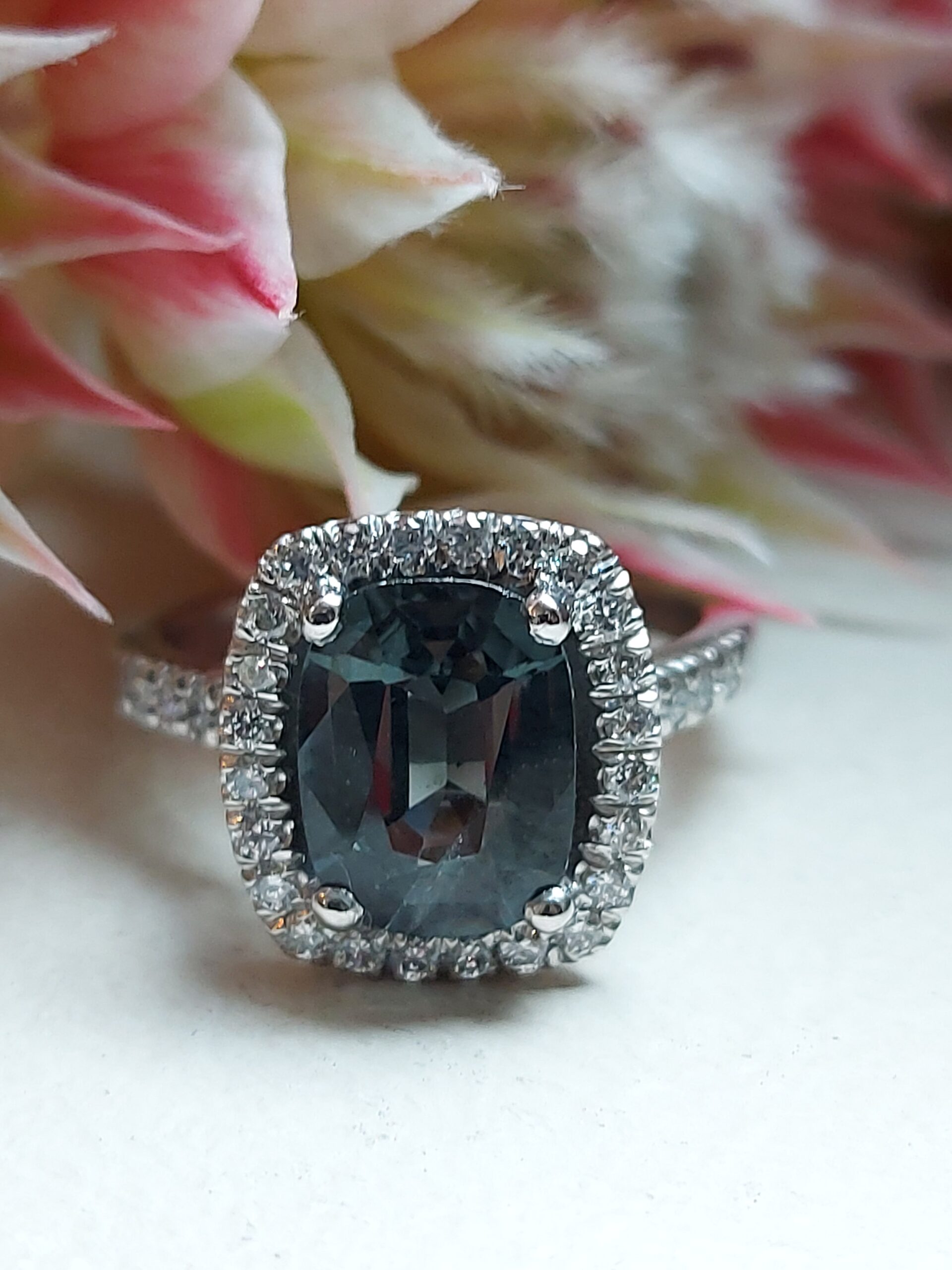 Bague en or blanc 750/1000° recyclé sertie au centre, sur griffes, d’un spinelle taille coussin. L’entourage est composé d’un rang de diamants taille brillant sertis à grains. Corps demi jonc serti de diamants. Fabrication sur mesure.