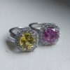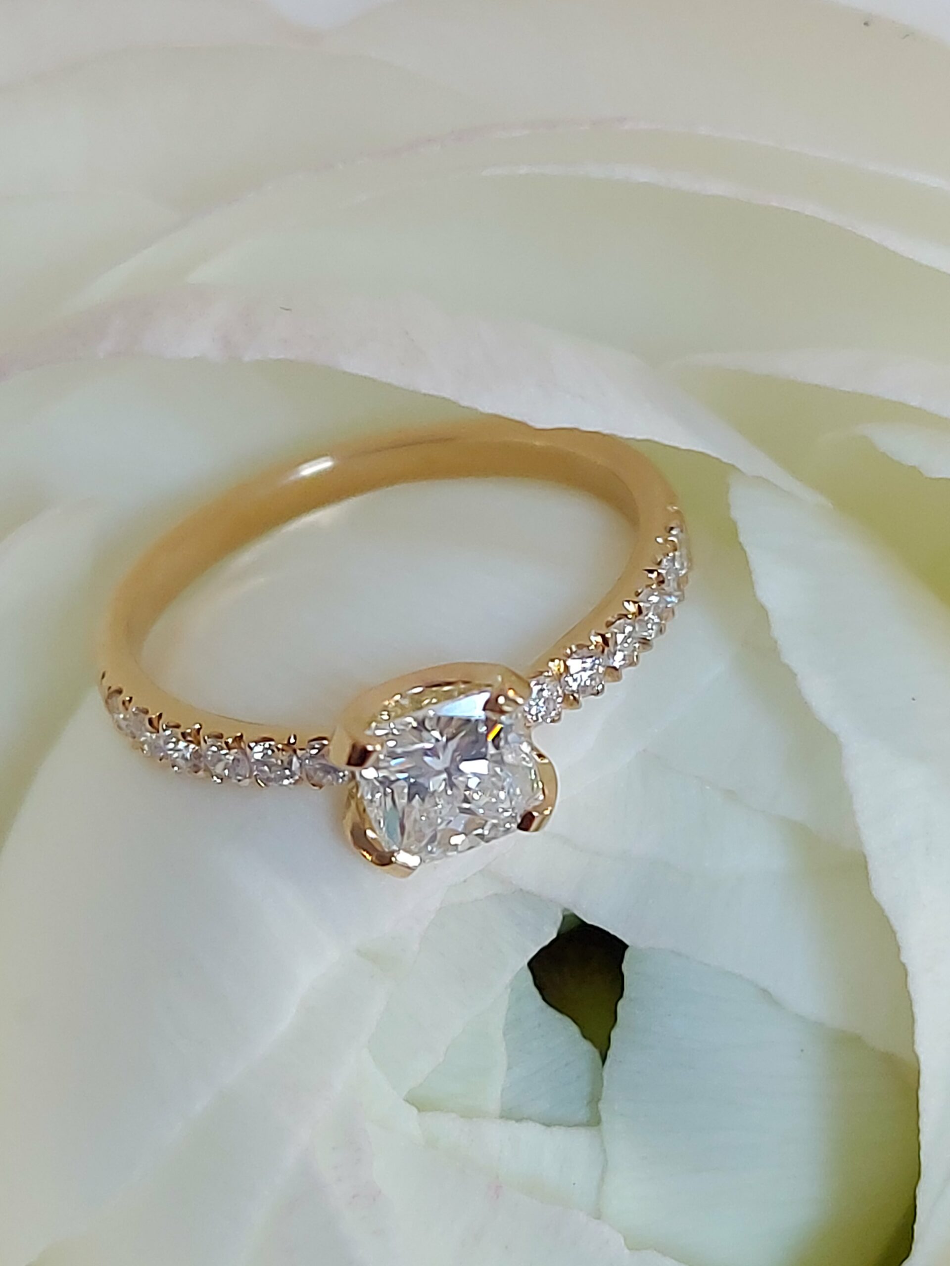 Bague en or jaune 750/1000° recyclé, diamant taille coussin au centre et plusieurs autres sur le corps.