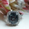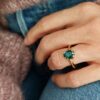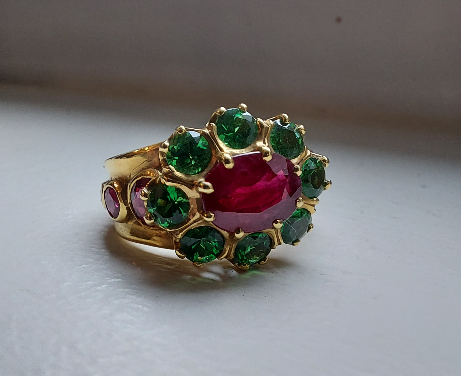 Bague en or jaune 750/1000° recyclé sertie au centre d’un rubis taille ovale, encerclé par des grenats tsavorites, d’autres rubis sur le corps.